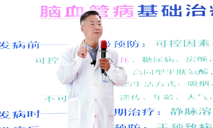 活动伊始,医院学术副院长兼4A脑血管病一科主任席刚明教授以《脑血管病防治中的相关治疗及用药 》为主题,用通俗易懂的语言,从中风的症状表现、常见诱发因素、科学预防、药物及介入治疗等方面,结合临床经验与具体案例,做了深入浅出的讲解,强调中风的救治重在“速度”,要掌握好中风救治4.5—6小时的黄金救治时间。一旦发生中风,及早救治十分重要,能够大大降低患者致死致残率。特别是中风高危人群及其家属,增强中风的急救意识往往能够减少“不幸”的发生。