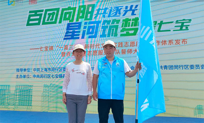 上海蓝十字脑科医院【同济大学附属上海蓝十字脑科医院(筹)】党支部副书记赵宇兰、社工部魏磊代表医院“蓝小爱”志愿服务队应邀亮相活动现场,获得了主办方授予的七宝镇“一育三给”新时代文明实践百支五星志愿服务团队旗帜,并共同宣誓:以志愿之名,承奋进之志......做好社区治理“勤务员”,争当美好家园“合伙人",尽己所能、服务社会......共谱文明进步“新篇章”。