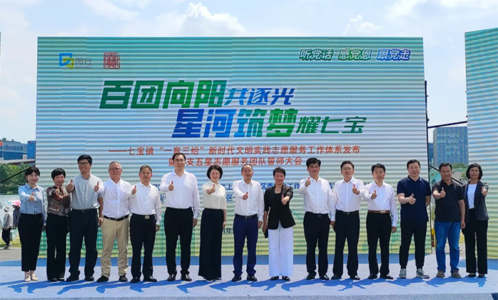 5月26日下午,七宝镇以“百团向阳共逐光,星河筑梦耀七宝”为主题,在闵行文化公园开展“一育三给”新时代文明实践志愿服务工作体系发布暨百支五星志愿服务团队誓师大会。闵行区委副书记唐劲松出席大会并致辞。区委社工部、区文明办、团区委等主要负责人,镇三套班子领导及处级干部,镇机关事业单位、各村、合作社党政负责人等出席会议。