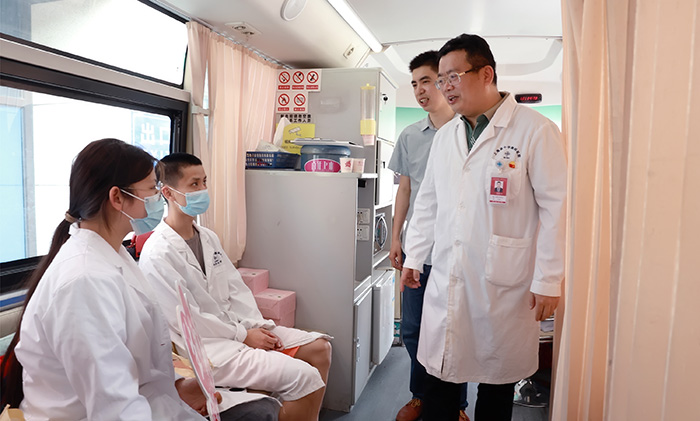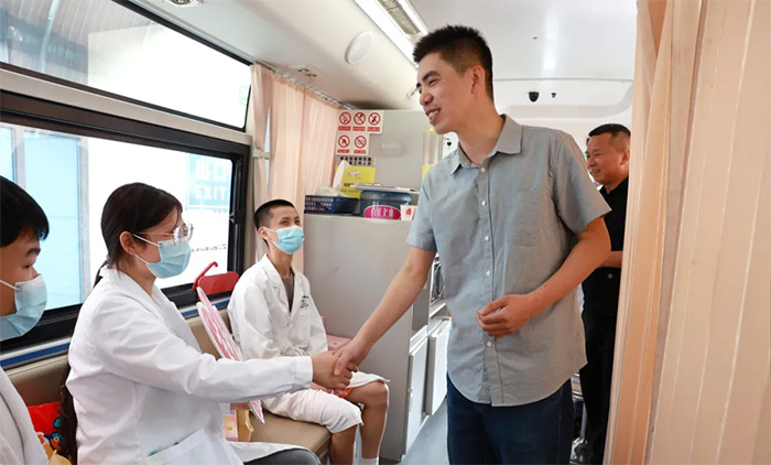 采血过程中,闵行区健康促进中心副主任朱斌、医院总经理兼书记朱敏、副总经理兼工会主席吴春芳等领导登上无偿献血车亲切看望慰问大家,感谢大家的无私奉献,叮嘱大家献血后要注意休息,并送上爱心礼包。