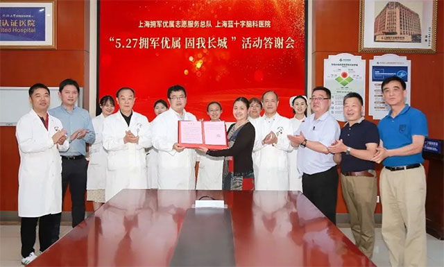 上海市拥军优属志愿服务办公室濮圣奎称赞了蓝十字在此次活动中表现突出,是出场医护人员最多,也是最早入场和最晚离开的健康医疗团队。尤其是项院长亲自带队,全体团队认真负责,提供专业的服务,这令我们很是感动。基金会理事长周太彤在蓝十字的“阵位”前驻足10多分钟,与项院长亲切交谈;千余名退役军人及家属前来咨询等等。而且,新华社,解放日报等官媒都采访报道了蓝十字脑科医院参加这次公益活动,东方网、上观新闻还专访了项耀钧院长等。官网、微信公众号点击量近百万人次。这是与院领导大力支持和亲临一线分不开的。