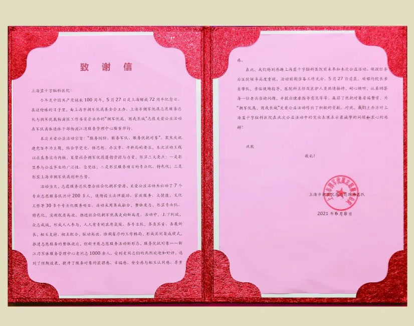 6月18日下午,上海市拥军优属志愿服务总队办公室陈惠云主任,办公室陈本俊、濮圣奎莅临上海蓝十字脑科医院,代表5.27庆祝建党百年“拥军优属 固我长城”志愿关爱公益活动主办方给医院送来了致谢信。这封赶赴实地、亲手送上的致谢信,道出了活动主办方对医院由衷的赞赏与感谢。