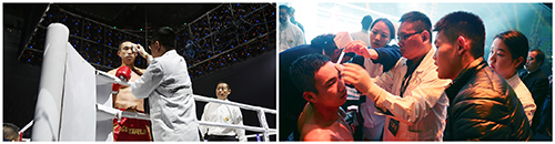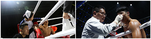 在两天进行的14场捉对厮杀中,不断有选手眉弓、嘴角、鼻子等部位外伤出血,上海蓝十字脑科医院医疗急救保障队医务人员均第一时间介入,采取及时有效的现场治疗措施,为选手进行止血和伤情判断。