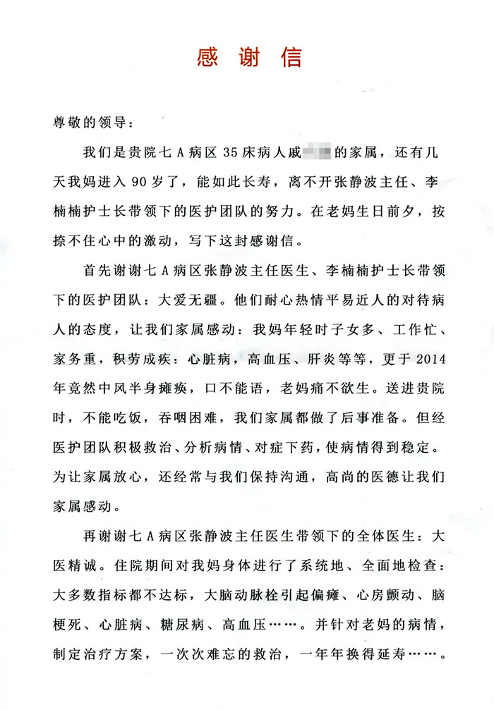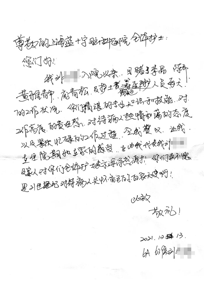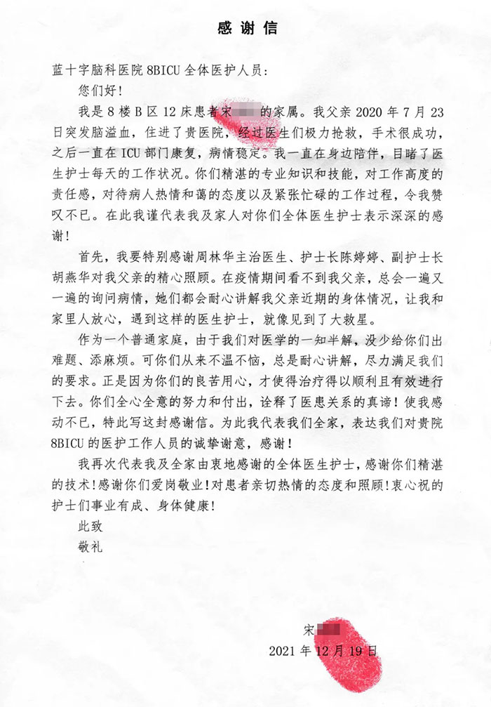 重拾健康,患者的感谢就是最美的勋章。真挚的情意洒落纸间,烙烫进每一位医护人员的心田。无论是6A神经外科病区医护团队,7B脑血管病科团队,还是8B神经内科重症监护室的全体医护,在12月这个冬季,感受到的不只是寒冷,还有来自患者的“暖阳”。