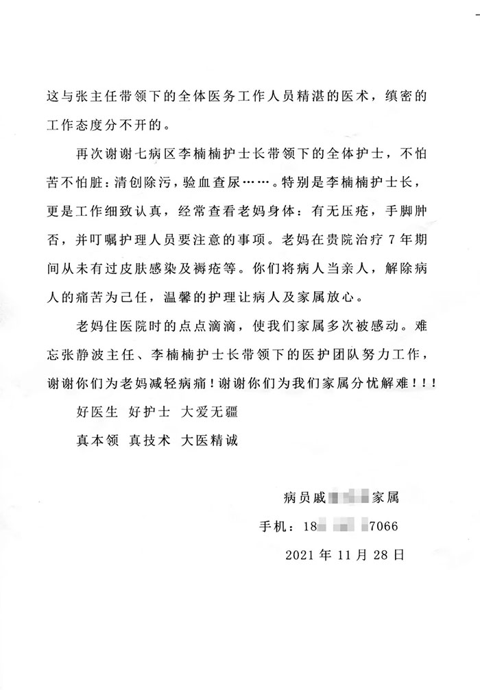 7年,2500多个日夜,对于危重患者来说,每一个日夜都是煎熬,是怎样的一种意志和坚强,才能帮助他们挺过那些最难熬的岁月!是7A神经内科主任张静波、护士长李楠楠,这两个爱笑的女孩,在黑暗中陪伴着他们,奋力前行。