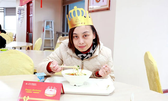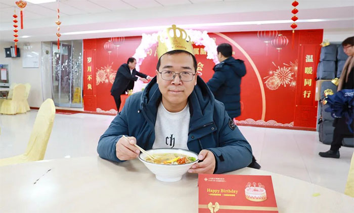 神经外科6A病区医生魏金星是科室青年骨干,入职不到2年,总是勤勤恳恳做事,踏踏实实工作,兢兢业业奉献。“很高兴加入蓝十字大家庭,领导关怀、同事友爱,如沐春风,感受到了如家一般的温暖。”他大口嗦着长寿面,最后还不忘发自肺腑地感叹一句,“生日会温馨,长寿面也挺好吃的。”