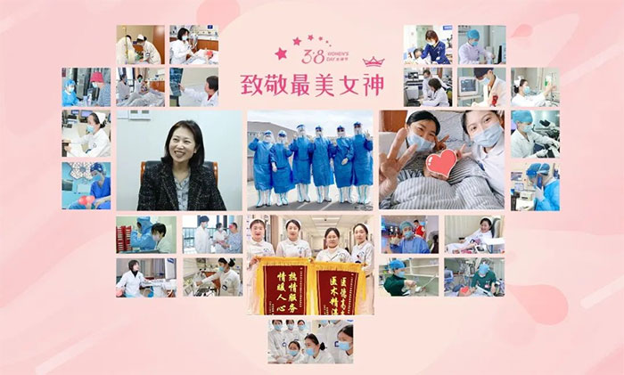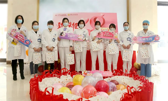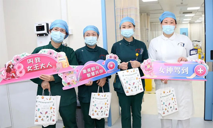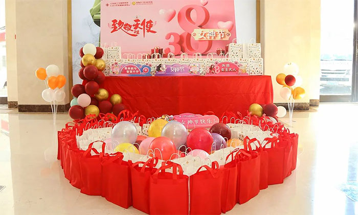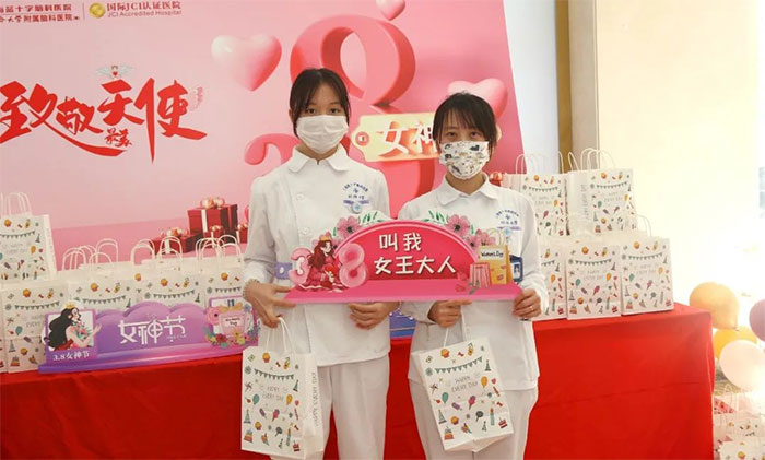 门诊大厅布置一新,“3.8女神节——致敬最美天使”的粉色画板默默宣示着——今天是特别的一天。“心”形的礼品堆头、缤纷的五彩气球和如花的灿烂笑靥交相辉映,编织成了这个春天最美的场景。