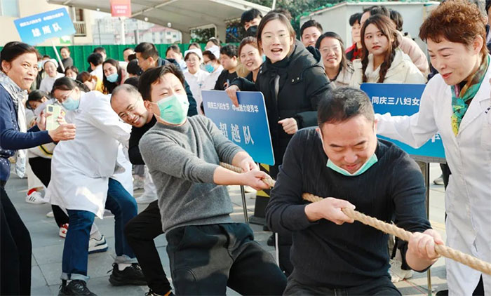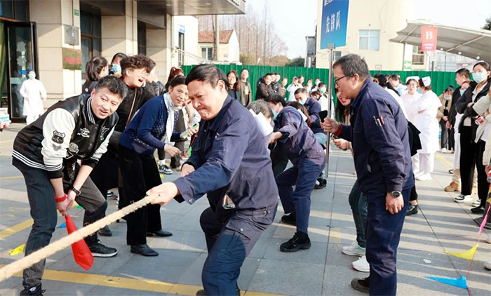 在总经理兼书记朱敏热情洋溢的致词中,比赛正式拉开序幕。致词中,朱敏总经理满言满语是对女同胞们节日的祝福及成绩的肯定。他指出,医院大力举办此次拔河比赛,采取男女合作的形式,不仅是希望女同胞们度过一个美好难忘的节日,展现巾帼风采,也是意在弘扬健康、团结、快乐的生活工作理念,激发广大干部职工锻炼身心,陶冶情操及建设发展医院的信心和情志。