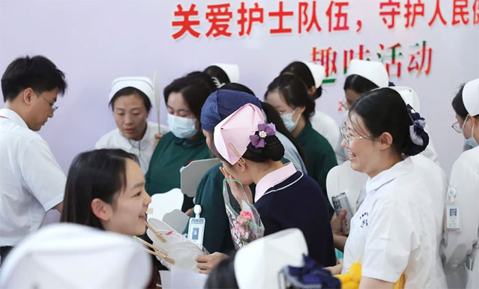 投壶场上,护士们瞄准目标,每一次精准的投掷都赢得了围观者的喝彩;套圈区内,大家争相尝试,每当圈中奖品,现场便响起一片欢呼声。还有非遗漆扇体验、时令鲜果品鉴......丰富多彩的活动,让现场迅速热闹起来,欢声笑语弥漫在每一个角落。银行工作人员与医护一道,共同在轻松愉快的氛围中收获满满,度过了一个开心而难忘的护士节。