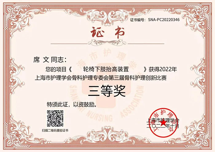 医院护理团队先后开展PICC置管术,为患者静脉输液治疗保健护航;开展鼻胃空肠管置管术,解决患者反流误吸问题。在护理科研上也是成果丰硕,论文《芝麻油在失禁相关性皮炎患者皮肤护理中的应用》被第五届上海国际护理大会壁报交流录用;论文《1例在DSA介入下处置PICC导管断裂的案例分析》,发表于《现代医药杂志》;一种骨科手术换药用套服,一种适用于膝关节及下肢骨折患者的轮椅获发明专利;轮椅下肢抬高装置,获得2022年上海市护理学会骨科护理专委会第三届骨科护理创新比赛三等奖。