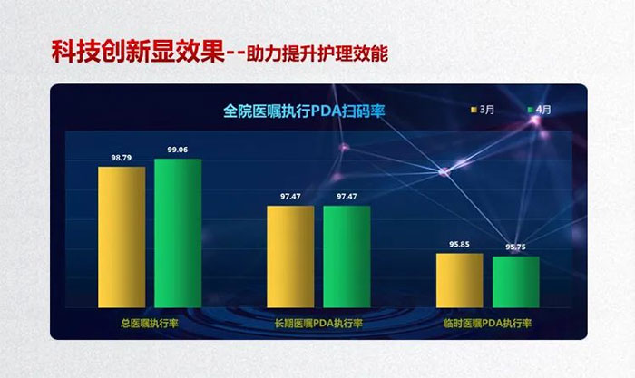 目前,全院总医嘱PDA执行率达到99.06%。信息化护理管理系统在医院全面使用,规范了护理工作行为,提升了护士工作效率,保障了临床护理工作安全,提高了工作质量,逐步实现了护理管理的现代化、科学化、精细化,也实现了管理可视化,构建起了护理“全景指挥舱”,辅助临床护理决策支持,促进护理科研的发展。