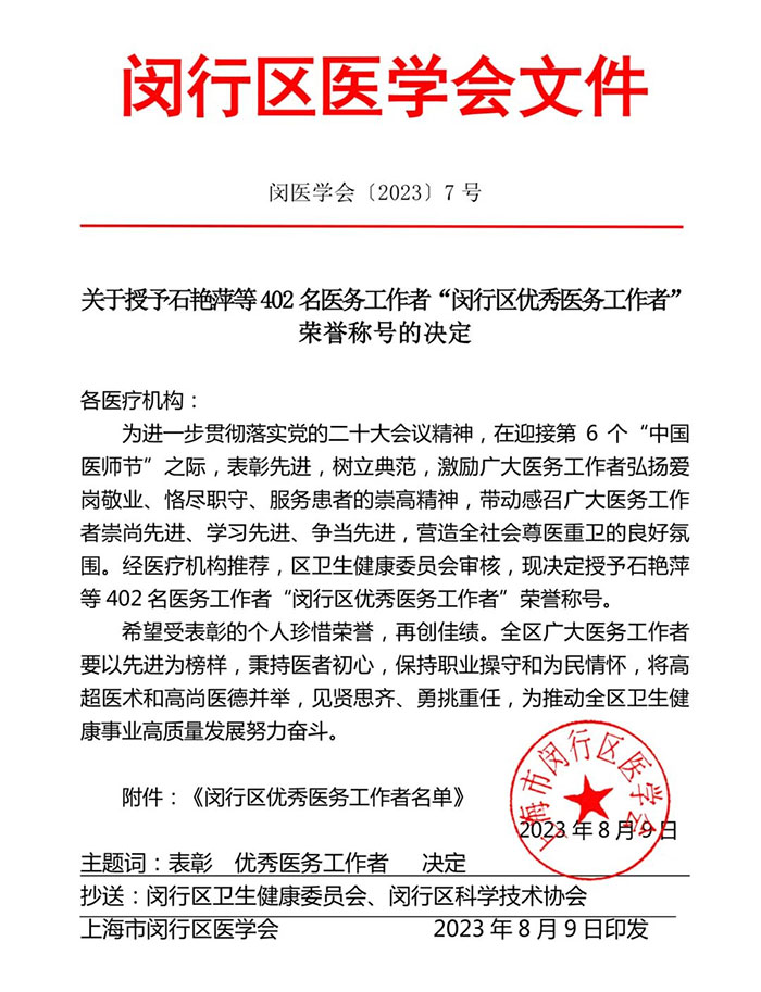 为深入贯彻党的二十大会议精神,迎接第六个中国医师节,表彰先进,树立典范,激励广大医务工作者弘扬爱岗敬业、恪尽职守、服务患者的崇高精神,感召广大医务工作者崇尚先进、学习先进、争当先进,营造全社会尊医重卫的良好氛围,经各医疗机构推荐,区卫生健康委员会审核,闵行区医学会授予了402名医务工作者“闵行区优秀医务工作者”荣誉称号。