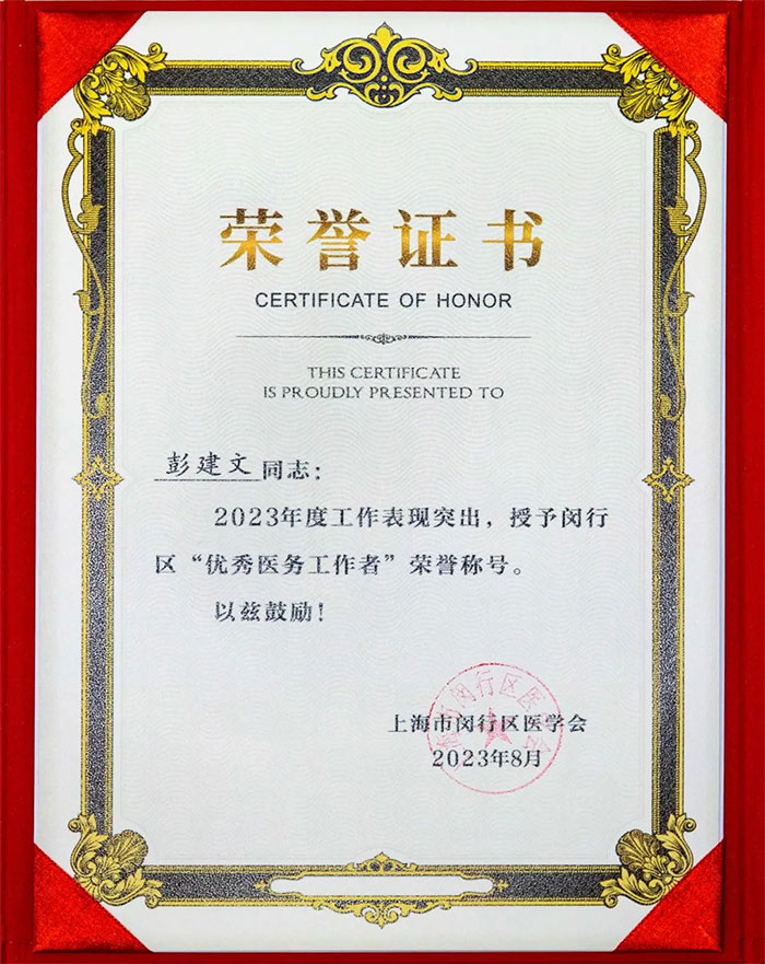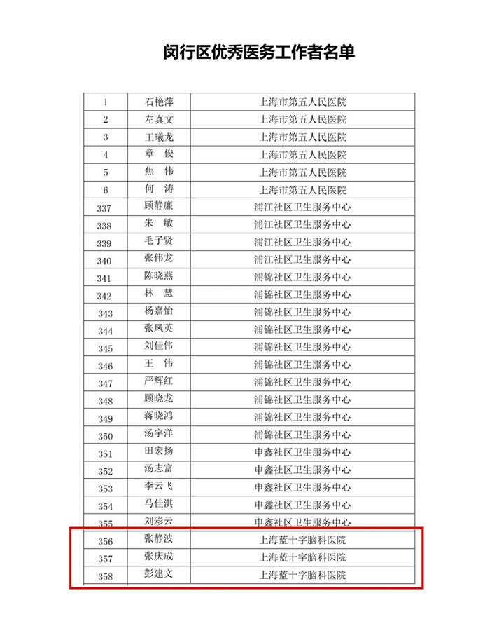 上海蓝十字脑科医院神经内科7A病区主任张静波、神经内科重症监护8A病区主任张庆成、康复治疗师彭建文三名医师获得“闵行区优秀医务工作者”荣誉称号。