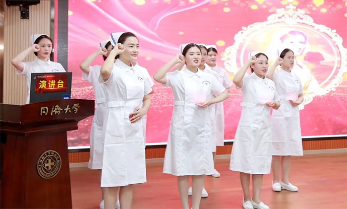 随后,在新履任总护士长赵得梅的带领下,大家肃然起立,左手捧烛、右手举拳,在护理创始人南丁格尔像前庄严起誓,“我宣誓,敬奉社会主义人道主义的精神,坚定救死扶伤的信念......永葆白衣天使的圣洁......”,“继承发扬南丁格尔精神,矢志投身光荣的护理事业”。誓言在摇曳的烛光中荡漾,初心在庄严的誓言间升华。