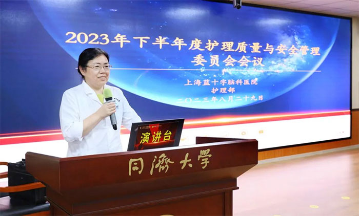 护理部主任助理、质控总护士长舒畅首先汇报了医院《2023年上半年护理质量与安全分析报告》。她从2023年上半年度护理不良事件汇总、2023年上半年度护理敏感指标数据分析两方面进行了详细汇报。