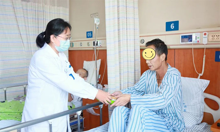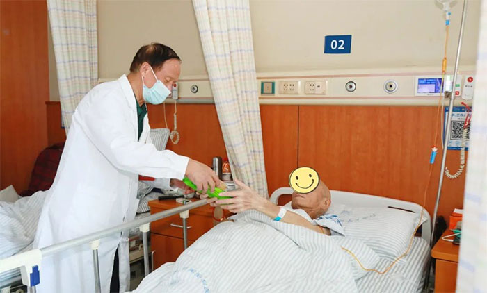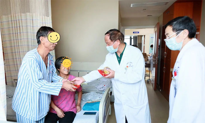 患者钱爷爷今年67岁,是一位胃癌的患者,来上海蓝十字脑科医院康复治疗一段时间,病情明显好转。看到胡主任一行过来慰问,钱爷爷拉着胡主任的手激动的说:“谢谢您,谢谢您,在您的治疗下,我的病情好多了,过节了你们还惦记着我们,你们真是太好了!”