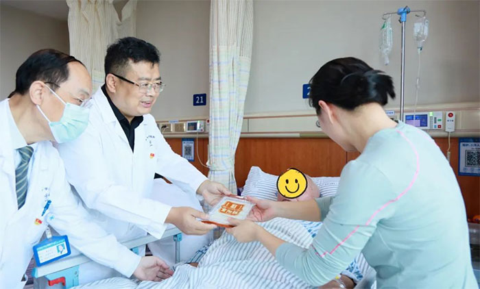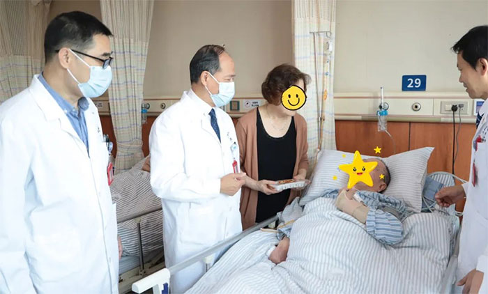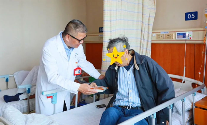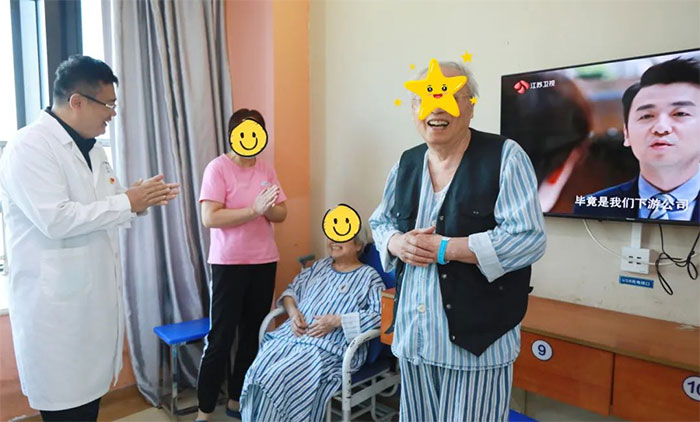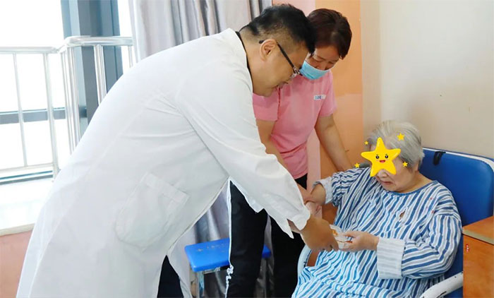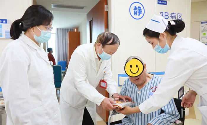 6A病区的金奶奶是一名退休教师,因脑梗死、骨折等入住医院,入院时卧床、生活不能自理、不识人,一度病危,经过精心救治、护理及康复,如今已能下床行走,也能认得亲友。在中国传统节日重阳节收到朱敏总经理送来的重阳糕和慰问,金奶奶及家属十分感动。“感谢院领导的关心,想得这么周到;感谢医生护士的精心照护。谢谢!”金奶奶的家属说到。在亲友的鼓励下,金奶奶现场吟诵了王维的诗歌《九月九日忆山东兄弟》。