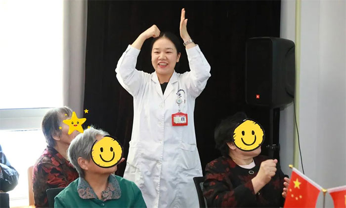 医院门诊部、客服部主任罗佳带领老人们跟随视频一起做“提神醒脑手指操”。院感科王晓静和微型消防站站长陈伟智分别为老人们演唱了京剧《梨花颂》及歌曲《朋友》。互动拉近了距离,也传递了温暖,现场弥漫着欢声笑语。