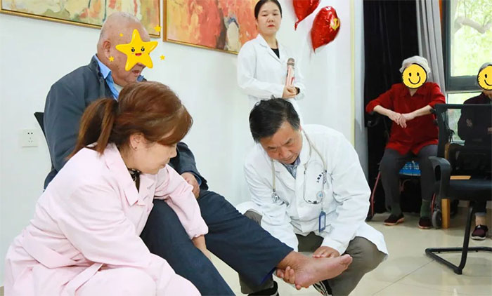 康复科张雁老师及三位年轻康复师的推拿按摩也受到了老人们的欢迎,吸引老人们踊跃上台体验。