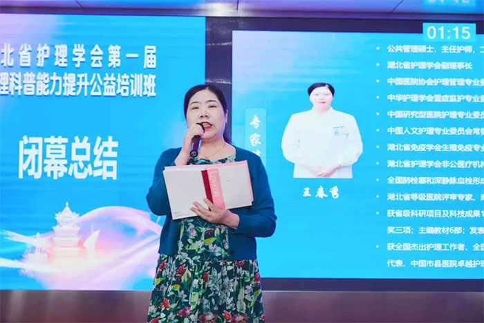 上海蓝十字脑科医院护理部主任、中华护理学会重症护理专业委员会专家库成员王春秀作为湖北省护理学会第十五、十六届理事会副理事长应邀参加活动,担任科普竞赛评委并主持活动闭幕仪式。