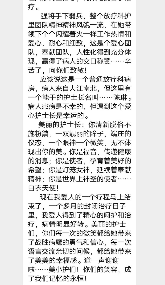 万般皆是情。护士长陈琳的专注敬业,以及待患如亲的温暖,不仅融化了彭女士心头的“坚冰”,也深深打动了家属的心。在彭女士病情好转临近出院之际,她爱人将全家的感动、感激和感谢,化入千字长文,传给了这位3B病区的 “最美护士长”。让陈琳护士长也深深感动了一会,激动的心情久久不能平静。