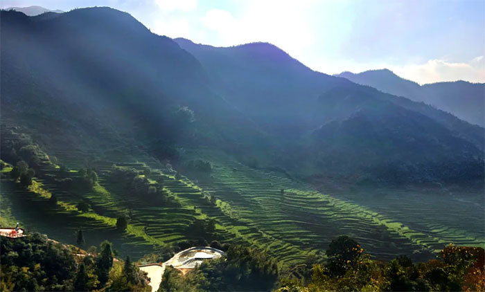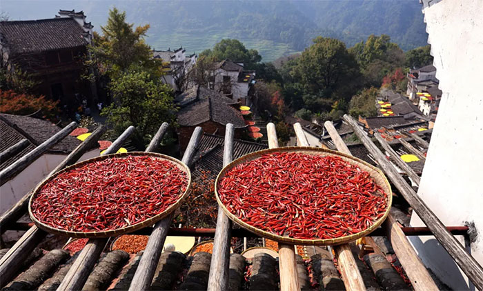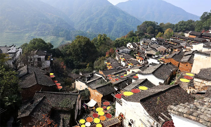 千棵古树环绕,万亩梯田簇拥。篁岭(梯田人家)独特地貌,U形村落被誉为南方的“布达拉宫”。其更是因“晒秋”闻名遐迩。“晒秋”是篁岭古村500年来延续至今的晾晒谷物特色民俗景象。每到秋收季节,家家户户在屋顶搭起晒架,用竹匾晾晒一年的丰收。