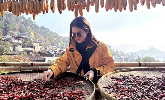 山间错落有致的徽派民居和五彩缤纷的谷物交相辉映,劳动人民丰收的喜悦和对未来生活的美好期待深深感染着大家,徜徉其间,仿若置身于“篁岭晒秋图”的壮美画卷中。