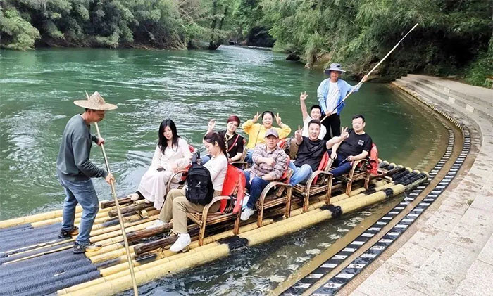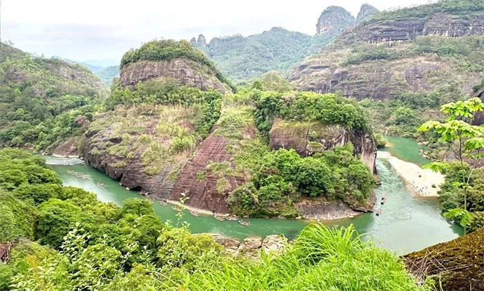 九曲溪有“中国最美的溪流”之称,清澈的溪水是武夷山的灵魂。峰岩交错,溪流纵横,九曲溪贯穿其中,蜿蜒十五华里,盈盈一水,折为九曲。团队成员们乘坐古朴竹筏荡入山光水色。峰峦耸秀,碧水如镜,两岸景致宛如百里锦绣画廊。大家既领略了武夷山生态之美,又对习近平总书记“绿水青山就是金山银山”的理念有了更加深刻的领悟。