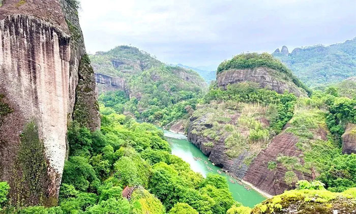 作为闽浙赣和中央革命根据地重要组成部分,武夷山被誉为“红旗不倒”的革命老区。一路上叠峦抱翠,奇峰险峻,风啸岩壑,泉挂松间,令人心旷神怡。登顶天游峰和虎啸岩放眼四望,无限风光尽收眼底。
