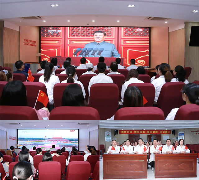 7月1日上午8时,庆祝中国共产党成立100周大会在北京天安门广场隆重举行。中共中央总书记、国家主席、中央军委主席习近平发表重要讲话。上海蓝十字脑科医院党支部书记兼总经理朱敏等医院高层领导带头,党支部成员及部分医护代表在十楼多功能会议厅集中观看了大会实况直播,共同庆祝中国共产党成立100周年。