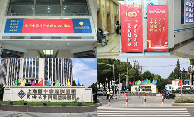 喜迎党的百年华诞,医院到处洋溢着喜庆氛围——院外四周彩旗飘扬,院内门诊大厅LED屏幕上“庆祝中国共产党成立100周年”赫然醒目,显眼位置处的祝福易拉宝红艳亮丽......