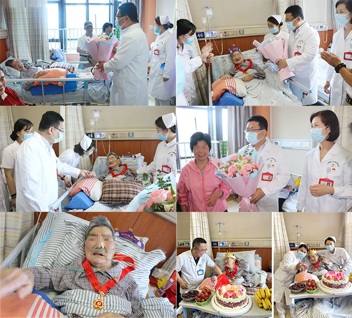 下午,党支部书记朱敏带头专程看望这位老寿星并与4A病区医护人员一起为老人家庆祝88岁寿辰,祝福老寿星早日康复。朱敏书记动情地说:“作为一名老党员,潘奶奶五十八年如一日立足本职、拼搏奉献。每一位老党员都是一本生动鲜活的‘教科书’,他们一心向党、不忘初心,这样的思想境界、革命精神和优良作风,值得我们广大党员干部认真学习传承。”
