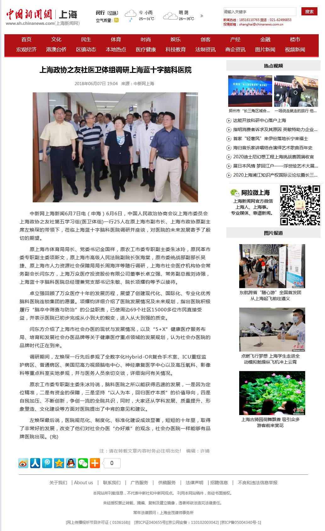 中新网上海新闻6月7日电(申海)6月6日,中国人民政治协商会议上海市委员会上海政协之友社第五学习组(医卫体组)一行25人在原上海市副市长、上海市政协原副主席左焕琛的带领下,莅临上海蓝十字脑科医院调研并座谈,对医院的未来发展寄予了殷切的期望。