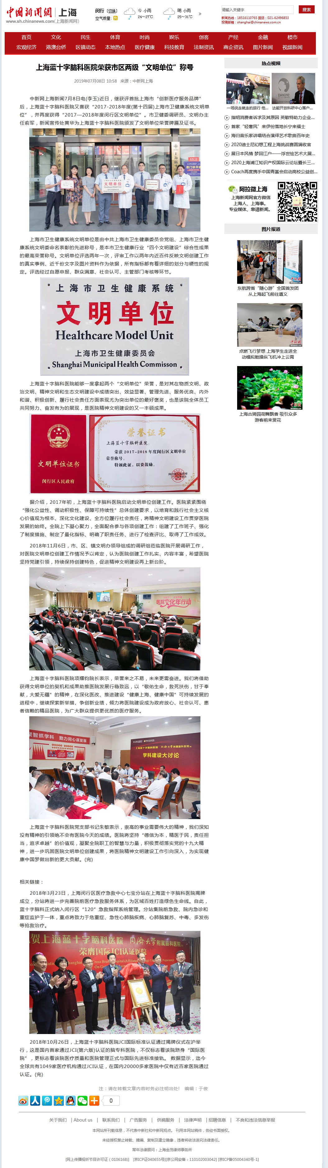 中新网上海新闻7月8日电(李玉)近日,继获评首批上海市“创新医疗服务品牌”后,上海蓝十字脑科医院又喜获“2017-2018年度(第十四届)上海市卫生健康系统文明单位”,并再度获得“2017—2018年度闵行区文明单位”。市卫健委调研员、文明办主任俞军,新闻宣传处黄华为上海蓝十字脑科医院颁发了文明单位荣誉牌匾及证书。