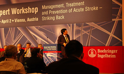 这是孙晓江主任第一个成功进行急性期脑梗死溶栓的患者,鼓舞了他继续前行在溶栓研究的道路上,到目前为止他已成功溶栓治疗的患者不胜枚举,也因此获得患者的一致好评与同行的赞扬。之后他作为中国受邀专家参加在意大利召开的16届欧洲卒中大会记者招待会;随后又作为大会主席团成员出席在维也纳召开的国际卒中大会,是此次大会主席团中亚洲唯一一个黄皮肤受邀专家,主持了欧亚分会场会议,并做学术报告,主要介绍中国和欧亚地区溶栓的情况。
