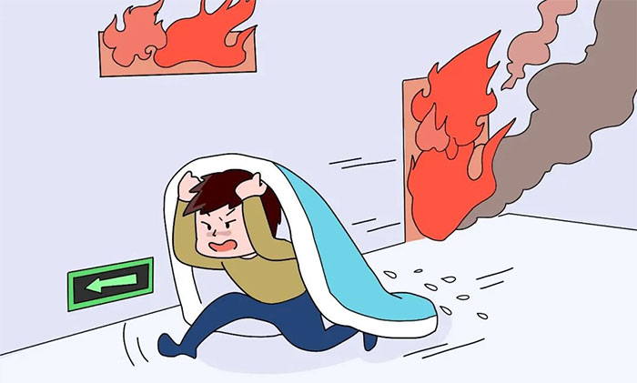 4、逃生时要防止烟雾中毒,可用湿毛巾或口罩蒙鼻,匍匐或弯腰撤离。穿过烟火封锁区时,如没有防毒面具、头盔、阻燃隔热护具,可向头部、身上浇冷水或用湿毛巾、湿棉被、湿毯子等将头部身体裹好,再行冲出。