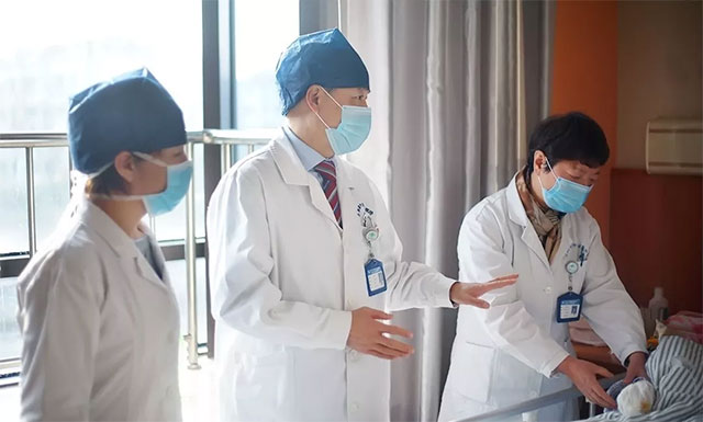 3B病区戴秀珍主任除了年初一回家给妹妹看病,其他时间都坚守在医院带领大家奋战在防疫一线。病人的情况时刻牵动着她的心,年初六和院长项耀钧一起为患者李阿伯会诊,患者家属得知项院长亲自来为亲人会诊后,表示感谢和放心。