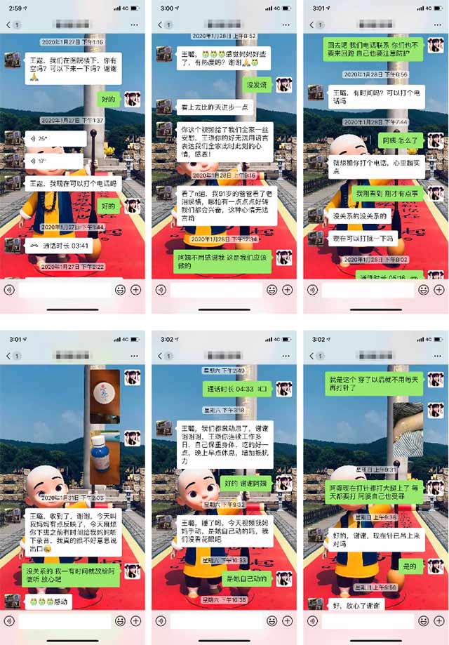 面对新冠病毒引发的肺炎疫情严峻时刻,家属们虽然表示理解,但他们不能亲眼见到自己的亲人,表示焦虑,每位患者的情况都牵动着背后的一个个家庭。蓝十字医护人员想家属所想,将优质服务细化深入,用微信通过视频、图片、录音等多种方式架起一座患者与家属之间的“连心桥”,让家属们及时了解患者病情、身体状态,多看一看自己的亲人,听听他们的声音,让家属安心。