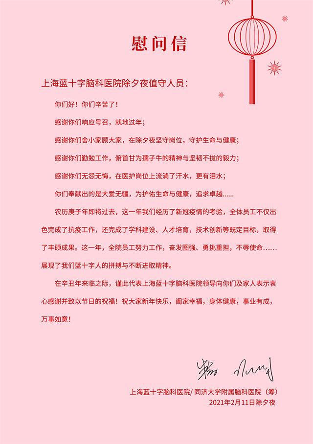 值此新春佳节之际,向上海蓝十字脑科医院的全体员工表示衷心的祝福和问候,祝身体健康,阖家欢乐,年年有余!