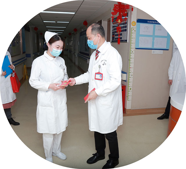 ▲ 项耀钧院长向坚守在除夕夜工作岗位上的医护人员拜年