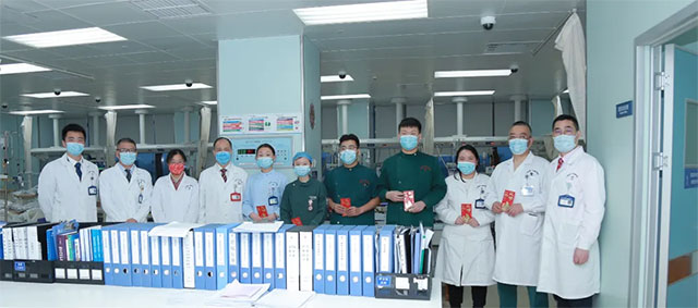傍晚时分,上海蓝十字脑科医院项耀钧院长、潘耀良副院长、周克祥副院长,吴启航副总等领导一起,向春节值班的医生和护士们拜年,向他们表示节日的问候和衷心的祝福,项院长代表医院为值守大年夜的医护人员及后勤人员送上医院的慰问红包;潘仁龙主任已连续多年值守。同时,项院长还慰问了留院病患,并向他们拜年,让病患非常感动,有位85岁的脑梗病患激动得回礼道:“也祝你们新年快乐,身体健康!”