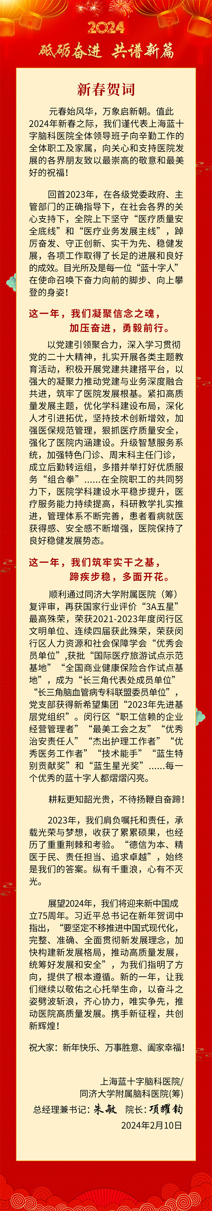 元春始风华,万象启新朝。值此2024年新春之际,我们谨代表上海蓝十字脑科医院全体领导班子向辛勤工作的全体职工及家属,向关心和支持医院发展的各界朋友致以最崇高的敬意和最美好的祝福!