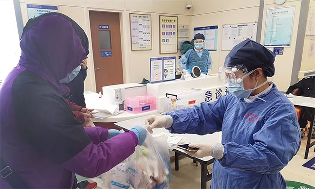 ▲ 急诊科护士长廖伟芳接收患者的医保卡并作好消毒处理