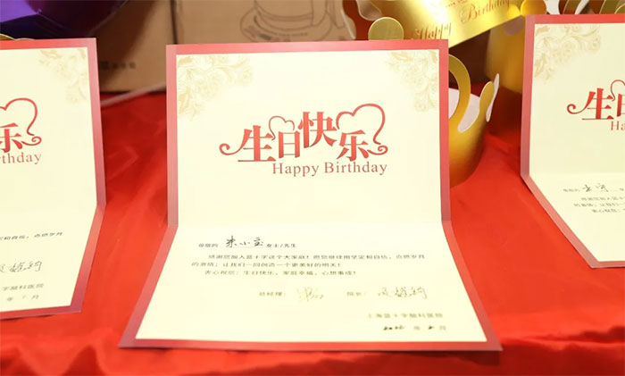 “祝大家生日快乐,虎气冲天!”医院总经理兼党支部书记朱敏、院长项耀钧、副总经理兼工会主席吴春芳等领导亲临生日会现场,除了送上必不可少的生日祝福,还为“寿星”们准备了精美的生日礼物。