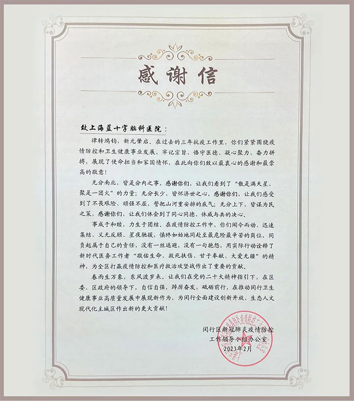 云开疫散,春暖山河;不忘初心,砥砺前行。这封感谢信既是对上海蓝十字脑科医院疫情防控和医疗救治工作的认可和肯定,更是对今后工作的鞭策和鼓励。上海蓝十字脑科医院将一以贯之守初心,一如既往担使命,继续发扬抗疫精神,不断提升医疗服务质量和水平,为患者提供更加安全、高效、便捷、优质的医疗服务,积极为闵行卫生健康事业高质量发展作出新的贡献!