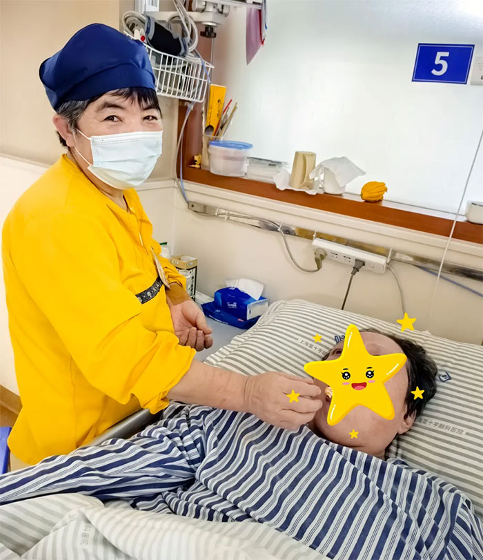 在医院工作了8年多的王阿姨正在给住院的患者喂橘子,从气管切开依赖呼吸机到现在能站立,王阿姨见证了病人的康复,病人也习惯了王阿姨的陪伴与照顾。