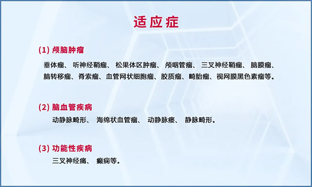 医院引进的玛西普MASEP SRRS型伽玛射线头部立体定向放射外科治疗系统,是一种融合现代计算机技术、立体定向技术和外科技术于一体的治疗性设备。具有定位精准、治疗精准、靶区剂量集中,周围正常组织受照剂量低的特点,可以使肿瘤局部得到准确的高剂量照射,避免肿瘤周围正常组织的损伤。能在缩短治疗时间的基础上,较大限度地保护患者不受额外辐射伤害。其适应症十分广泛,涵盖了: