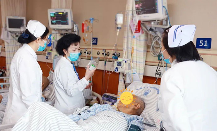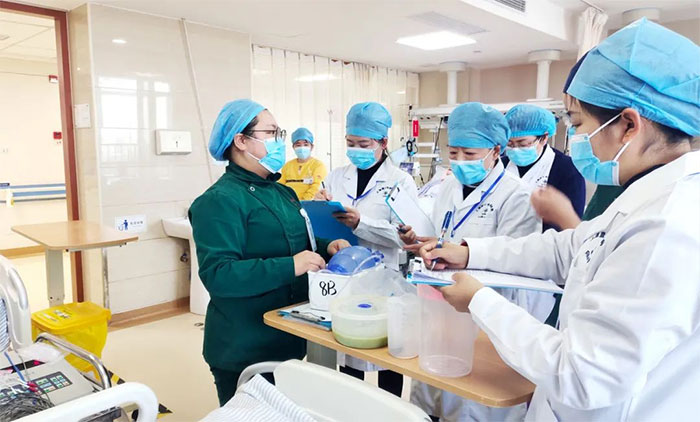朱建英主任率领危重(手术)患者追踪组,先后督查了神经外科重症监护室、神经内科重症监护8B病区、神经外科6A及6B病区。每到一个病区,都会驻足病床旁,仔细查看急危重(手术后)患者各项护理措施落实情况,并随机抽考当值护士鼻饲、胃管、吸痰、生命体征监测等知识及技能操作。