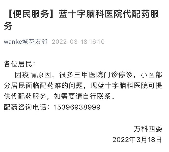 处于阶段性封控的小区居民,如有慢病药品需求,可请居委会与蓝十字脑科医院联系,医院将会第一时间为代配药的志愿者开通绿色通道,守护好居民的健康。