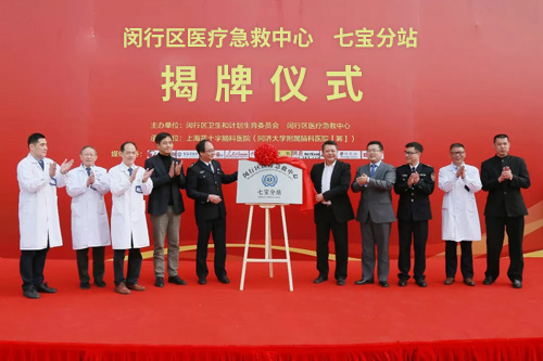 闵行区卫计委副主任程佳(右五)、医疗急救中心主任徐中杰(左五)、副主任蒋超(右三)、上海市脑卒中院前急救主任委员刘建民(左四)、上海蓝十字脑科医院党支部书记朱敏(右四)、院长项耀钧(左三)等领导为七宝分站正式揭牌